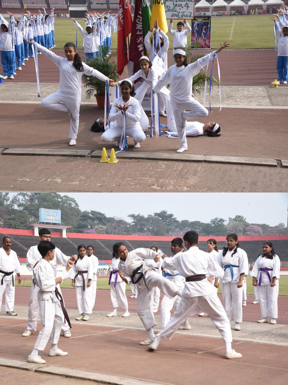 The March Past was followed by a drill display by the students of Kg II titled, The Glacial Guardians, highlighting the importance of environmental conservation, promoting awareness about nurturing nature, saving water and safeguarding the Earth. Through synchronized movements, the drill Trustful Hearts and Peaceful Steps by Std VI, conveyed a powerful message that peace begins with trust, unity and mutual respect. The students of Std IV brought the Solar System to life through the drill, Space Journey, celebrating togetherness, respect and diversity in the universe. Thereafter, the students put up a Karate performance.